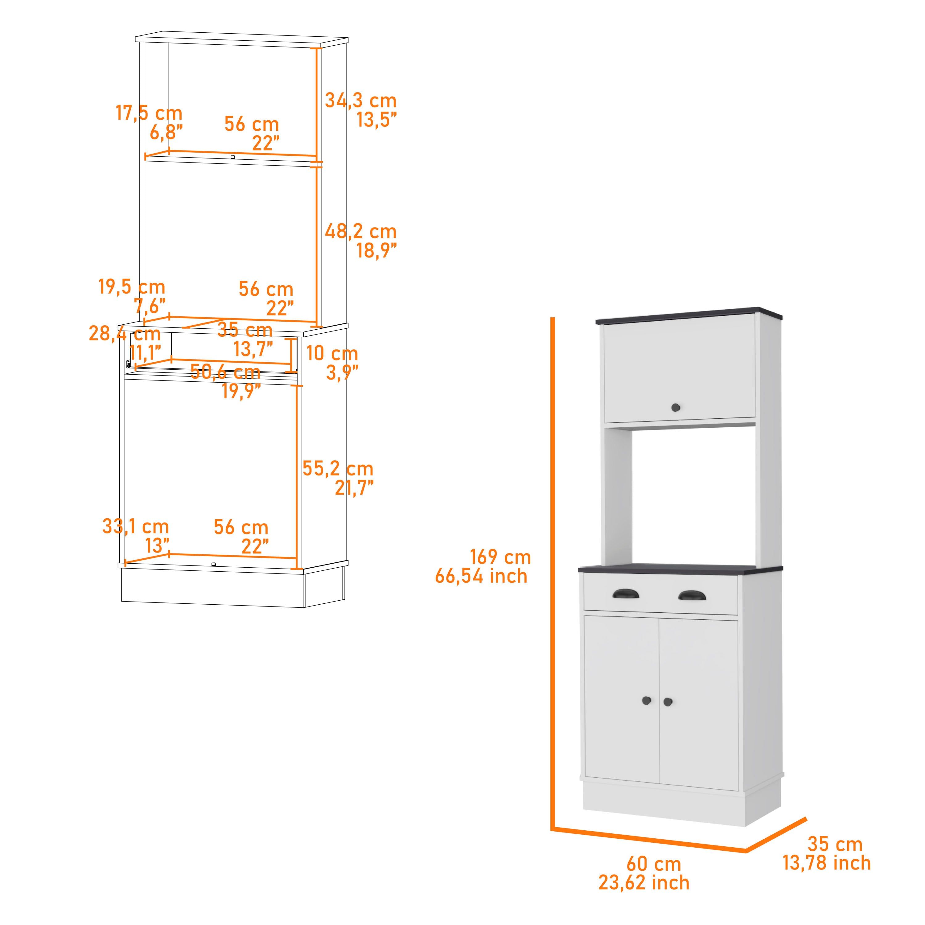 ¡Introducing the Tennant Kitchen Pantry: Your Versatile Storage Solution!.Transform your kitchen into an organized and elegant space with our Tennant Kitchen Pantry. Designed for maximum functionality and style, this pantry offers you a comprehensive solution to keep your kitchen tidy and well-organized.The upper cabinet, with dimensions of 13.5" x 22" x 6.8", provides ample space for your utensils, dinnerware, and more, keeping them within easy reach. At the bottom, you'll find another cabinet measuring 21.7" x 22" x 13", offering additional storage space for your kitchen supplies.In addition, the Tennant Kitchen Pantry features a spacious drawer measuring 3.9" x 19.9" x 11.1", perfect for neatly storing smaller kitchen utensils and accessories.But that's not all; our pantry also boasts a specially designed shelf to accommodate your microwave, allowing you to save counter space and maintain a clean and organized kitchen appearance.Crafted from high-quality manufactured wood, this pantry is available in two color options: elegant white and white with black. With a sleek and functional design, the Tennant Kitchen Pantry becomes a stylish addition that perfectly complements your kitchen.Dimensions of the assembled product:Height: 66,30'Width: 23,62'Depth: 13,78'Furniture Type: Ready to assemble (full assembly required).Certifications: CARB phase II compliant – TSCA Title VI Compliant.Warranty: 1-year warranty coverage in wooden parts- 1-year warranty coverage in hardware pieces since its manufacturing date found in the lot number printed in the product box.