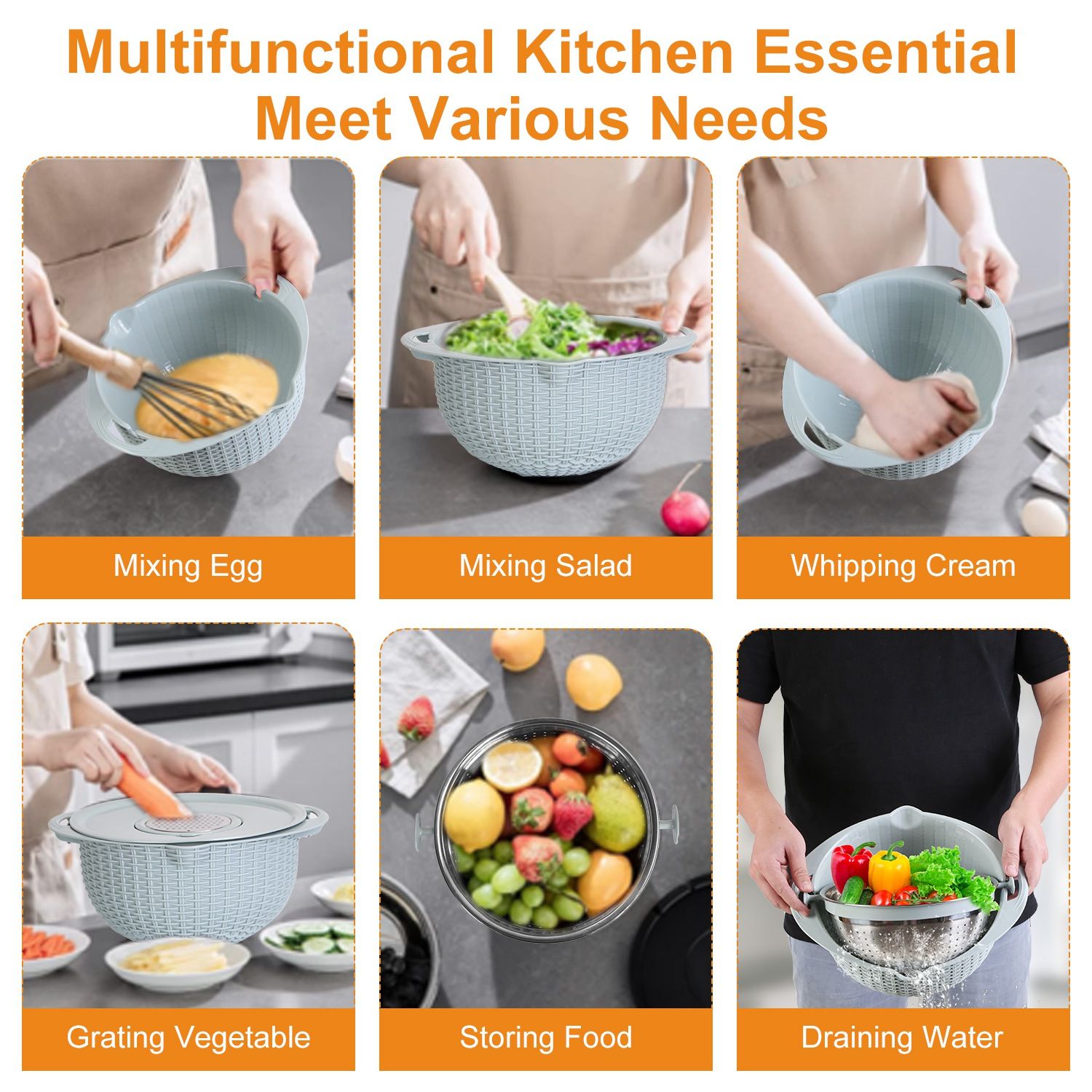 *Multi-Purpose Mixing Bowl with Colander Set*:Our large capacity mixing bowl with colander set includes 1x colander,1x mixing bowl,3x slicers,this multifunctional kitchen accessory is an essential helper to wash,drain,slice,mix and store fruits and vegetables,meets all your kitchen needs.