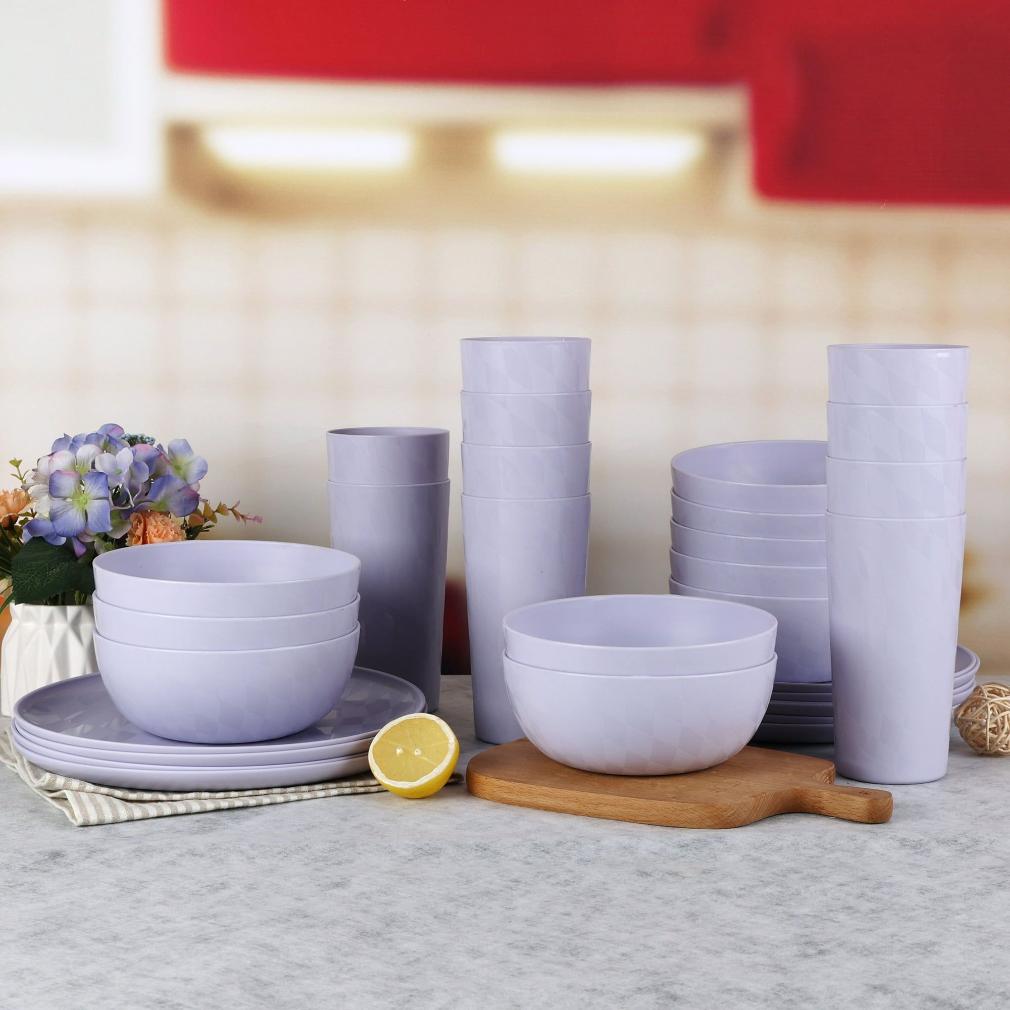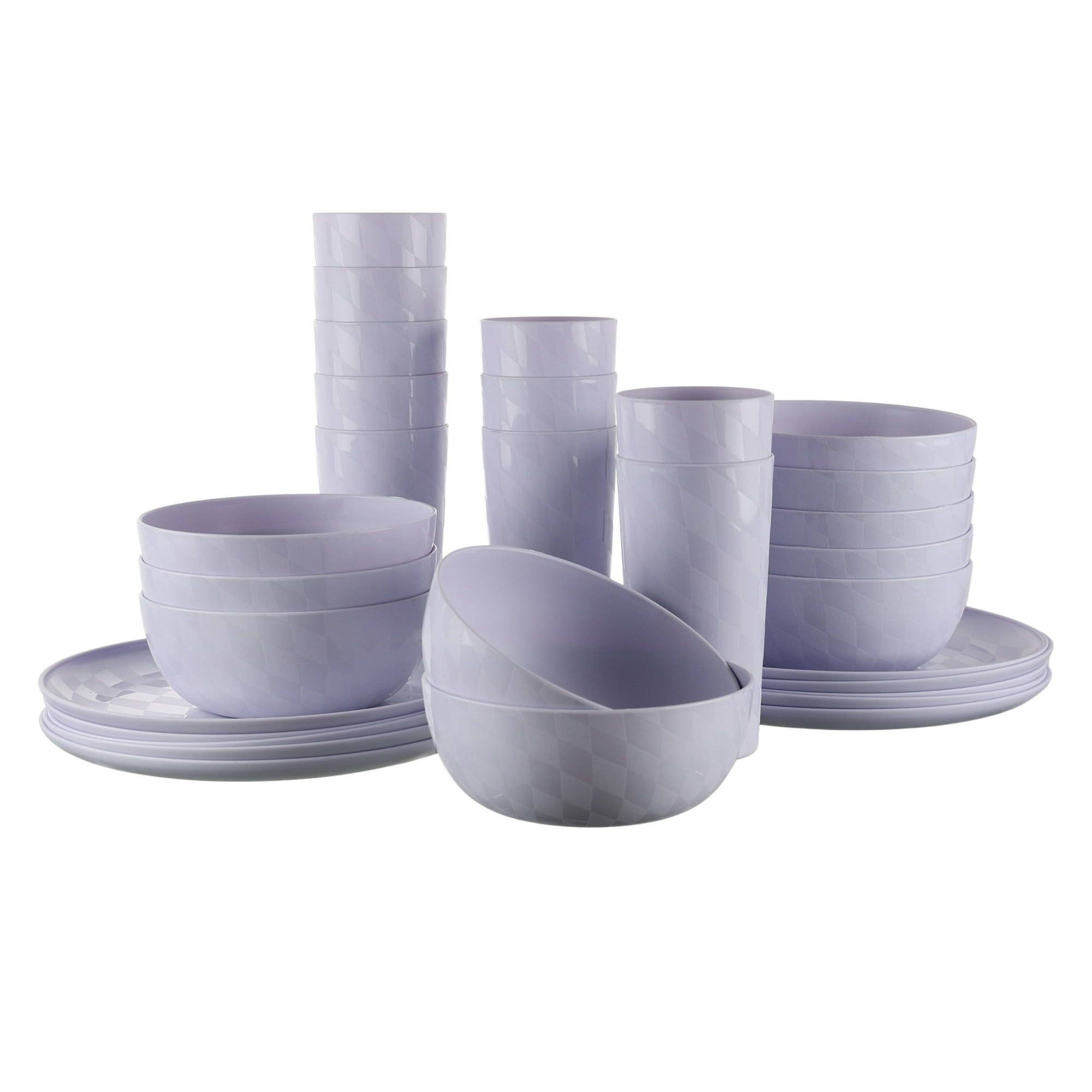 The 30-Piece Purple Plastic Checkered Etched Pattern Dinnerware Set combines functionality and style, offering everything you need to elevate your dining experience. Perfect for both beginners and those on the move, these dishes are an ideal choice for families, college students, or anyone looking to add a fashionable touch to their table. Each set includes 10 dinner plates (10.5 inches), 10 cereal bowls (38 ounces), and 10 tumblers (26 ounces), all featuring a matte finish that brings a contemporary, trend-forward look. Available in several colors, including a chic blue option, you can choose a single color for a sleek, unified appearance or mix and match to create a fun, custom vibe. The checkered pattern adds a hint of modern, making it great for everyday dining, gatherings, and even seasonal celebrations. Made from BPA-free plastic, the set is both dishwasher and microwave safe, offering a durable, low-maintenance solution that’s designed for both indoor and outdoor use. Matching dinner plates and tumblers are available!
