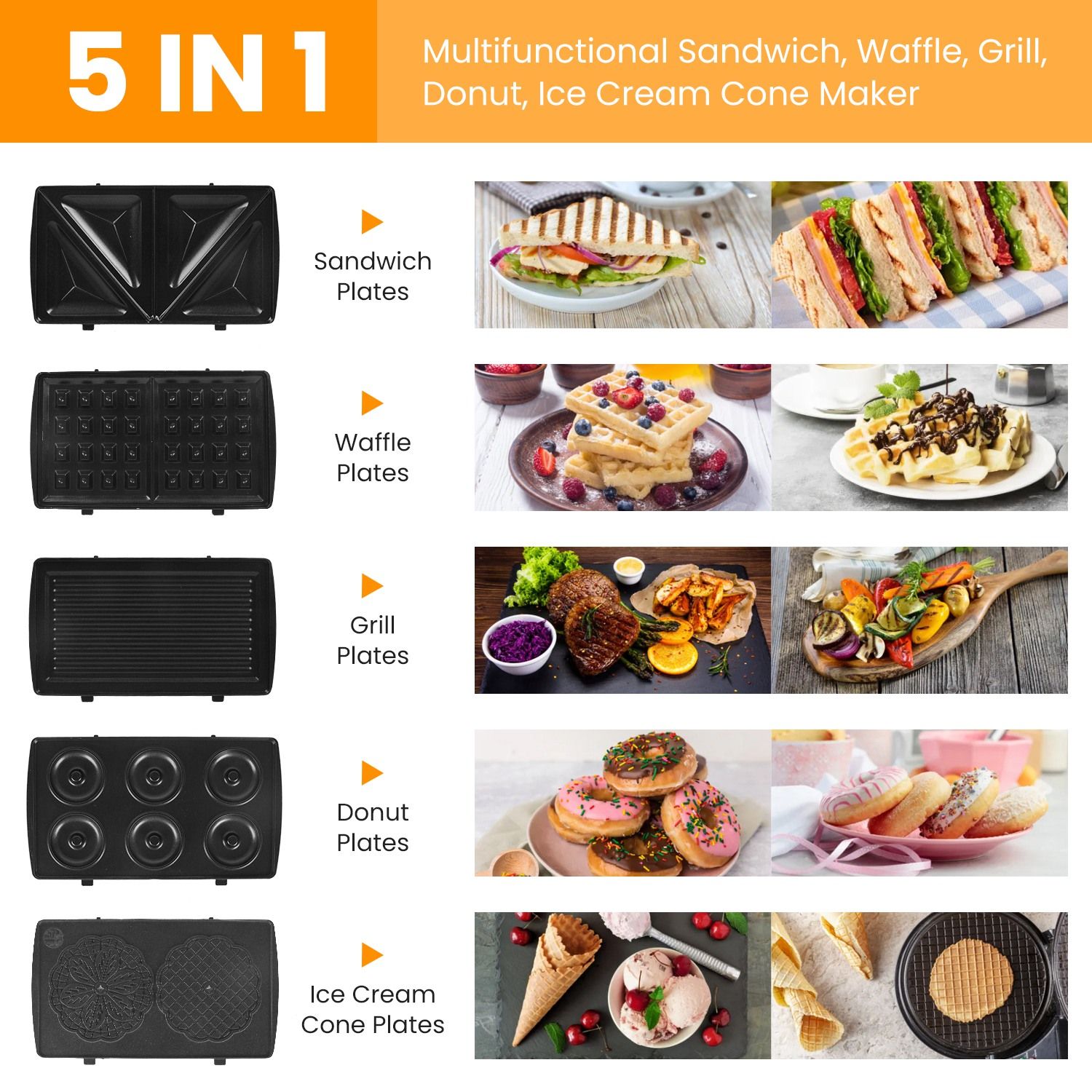*Removable Plates For Multiple Purposes*:Come with 3 removable plates:sandwich,waffle and grill plates,you can make sandwiches,heat bread slices,waffle desserts,steak,pork chops and corn,panini,vegetables and more. Simply plug in and pour your preferred batter into the designated compartment,this 2-slice sandwich maker is capable to bring you endless possibilities.