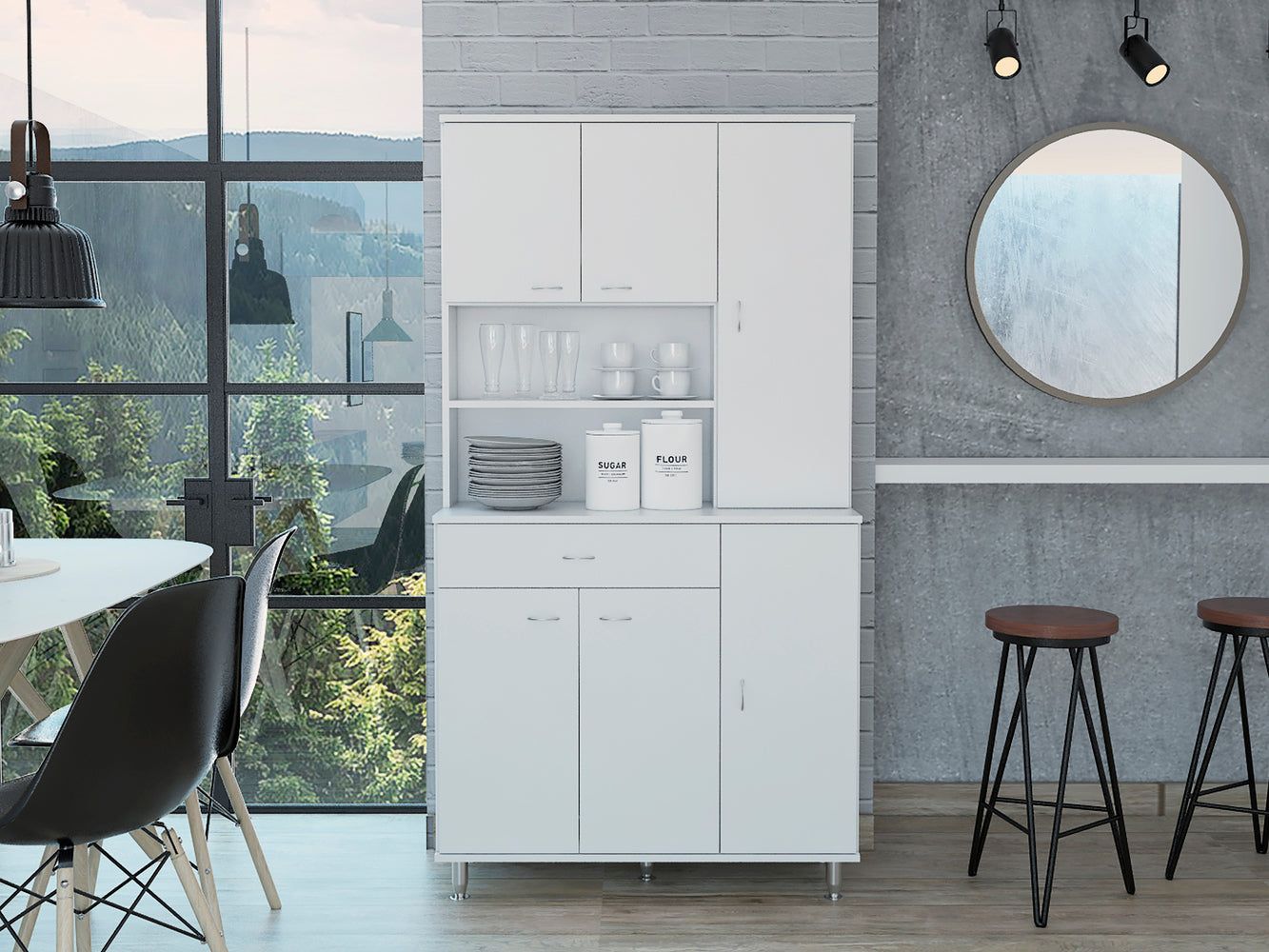 The Helis 90 Pantry Double Door Cabinet is a kitchen organization station that frees up valuable counter and cabinet space, holding your microwave, coffee maker, and other small appliances. It features pantry storage space that is maximized, six covered door panels with ten shelves and one large drawer for everything you need, perfect space to store dishes, pots, pans, and other household items, and one large drawer that's perfect for silverware or other dining utensils. Designed with elegant Black Wengue, White manufactured Wood finish.