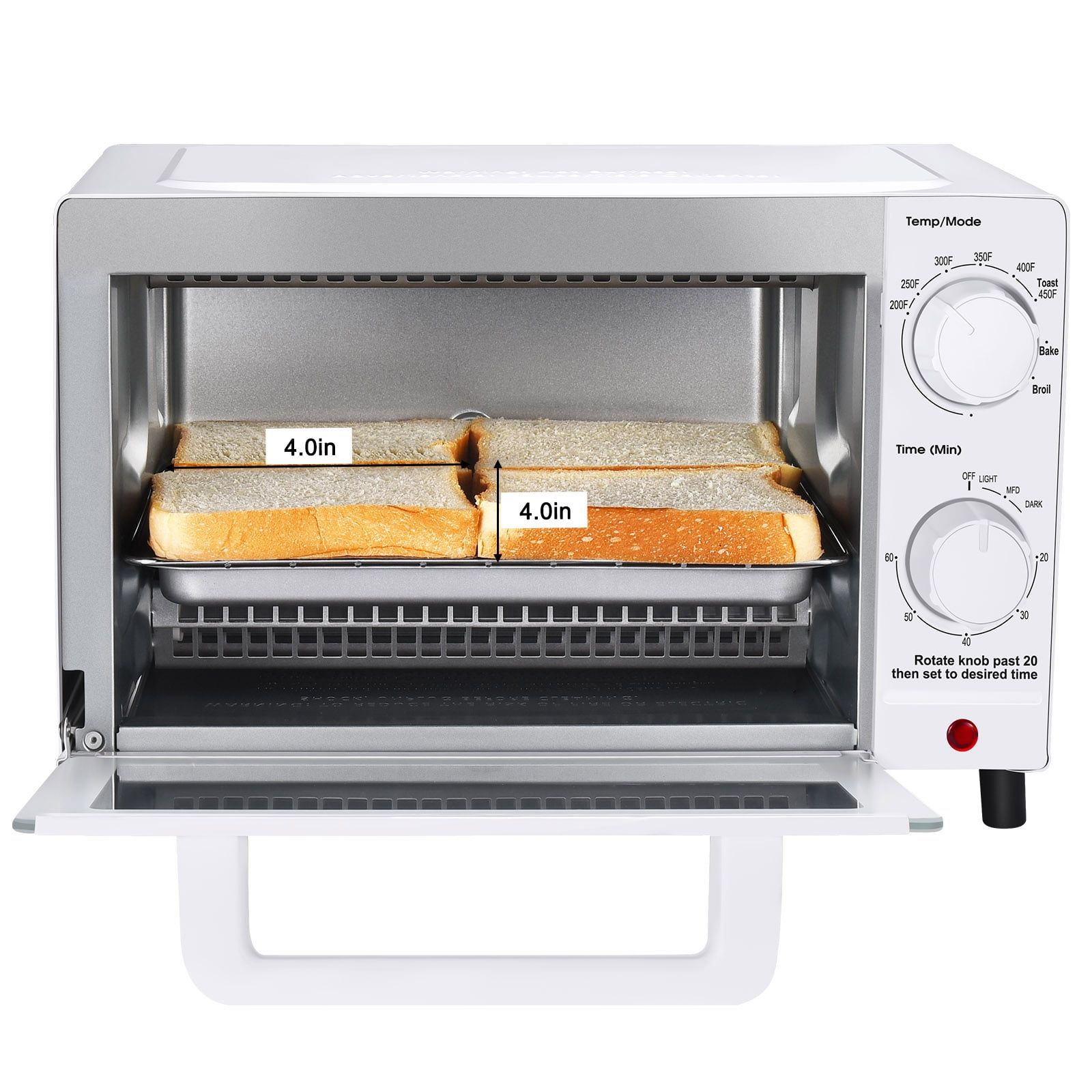 The  4 slice Toaster Oven makes your life more convenient and efficient. It is perfect for preparing toast, sandwiches, pizza, and so much more. This toaster oven can accommodate up to 4 slices of bread or a 9-inch pizza, making it an ideal choice for busy households. The turn dial allows for easy adjustments to temperature mode and time settings, ensuring mealtime is swift and smooth. The compact size of this toaster oven uses less energy and counter space, making it easy to store. The sleek white finish coordinates beautifully with existing kitchen decor and color palettes, ensuring it seamlessly integrates into your home. The baking rack and baking pan are included, and the oven exterior is easy to wipe clean for quick and easy cleaning. The Toaster Oven is sure to become a staple in your home cooking and baking ventures, bringing new experiences to your daily life. With its versatility, time-saving features, and stylish design, this toaster oven is a must-have for anyone looking to elevate their mealtime experience.