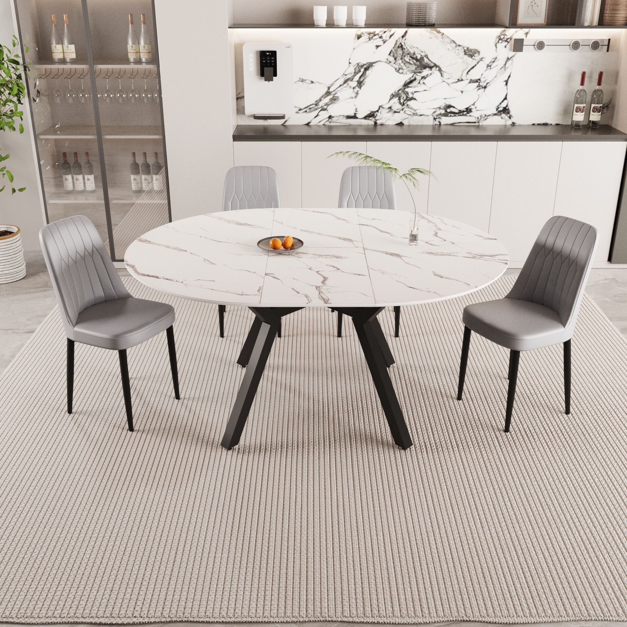 47-63" expandable circular dining tables , equipped with 4 PU fabric thick cushioned dining chairs and an elegant and spacious dining table