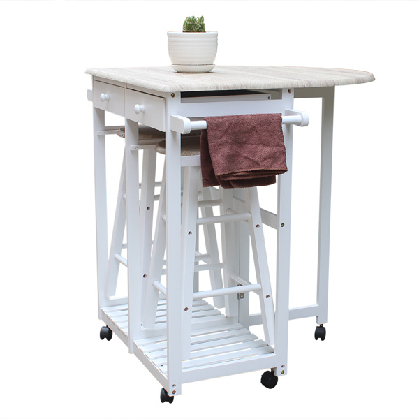 This is a foldable dining cart with two round bar stools. This dining cart is made of sturdy solid wood and PVC surface, which is environmentally friendly and safe. The tabletop can be expanded to extend the use space and can also be folded to reduce the occupied area, which is simple and convenient. There is a hand-pushing handle on the side of dining cart, which is convenient for pushing and pulling to various positions of house. The dining cart also has two drawers, which can accommodate some cutlery, chopsticks, spoons, etc. It is with two stable stools. When you need to use them, you can take them out directly from bottom of the dining cart and use as bar stools or dining stools. You can put them in directly to save space when they are not in use. If you want to have a simple and practical dining cart, this will be your best choice!