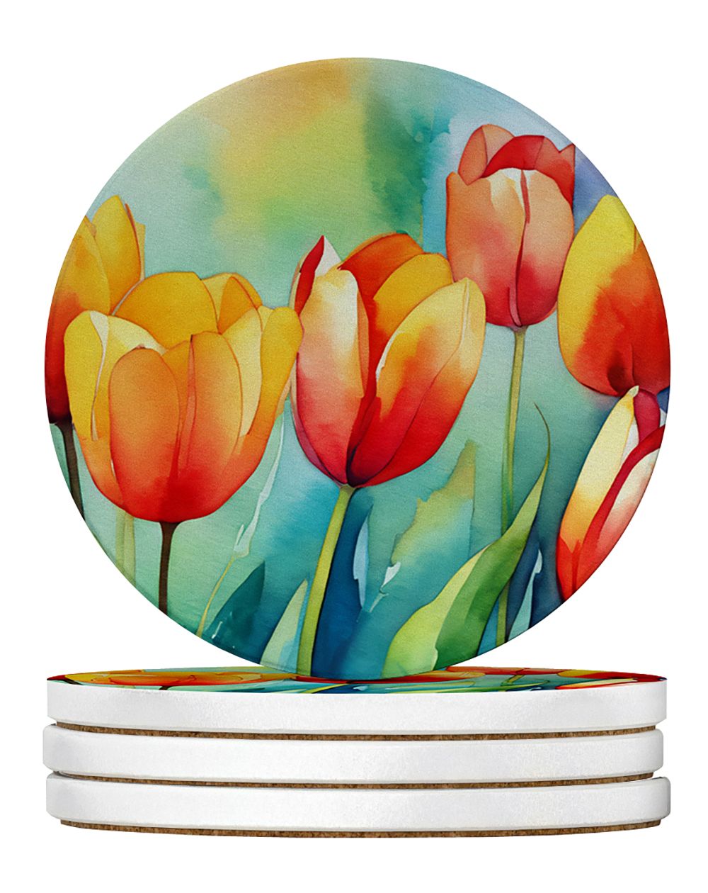 Home > Tulips in Watercolor Large Sandstone Coasters Pack of 4 Absorbent Round Coasters Decor Gifts for Men or Women, 4 in, Multicolor