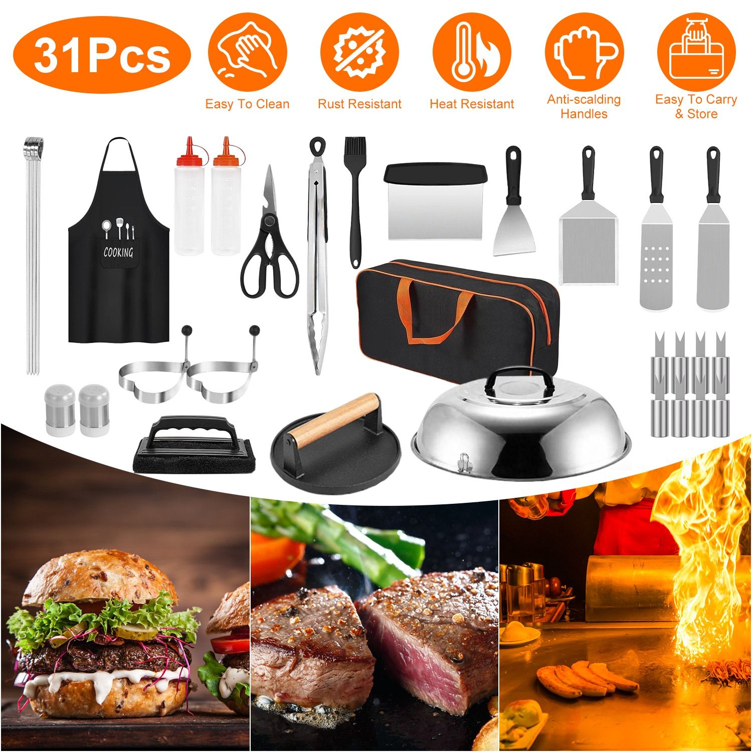 *31Pcs Complete Griddle Cooking Kit*:This griddle accessories kit includes everything you need for your griddle cooking:1x Long Griddle Spatula,1x Slotted Spatula,1x Large Burger Turner,1x Slant Edge Scraper,1x Chopper,1x Sauce Brush,1x Cleaning Brush,1x Griddle Press,1x Basting Cover,1x Apron,2x Squeeze Bottles,2x Spice Shakers,1x Grill Tongs,8x Vegetable Forks,1Pairx Scissors,4x Steel Sticks,2x Egg Rings and 1x Storage Bag. Perfect for anyone who loves grilling,whether for everyday meals or special occasions.