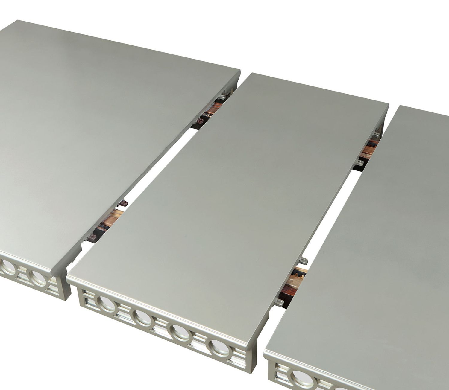 Product DescriptionProduct Description:-Dining in style is easy with this fabulous gray / silver dining table set. The table features intricate mirror designs on the apron and legs, brightening the room with soft, natural light reflections. Glamorous and opulent, this ensemble provided comfortable seating with an expandable leaf that offers plenty of space for friends and family alike. Product Dimensions:-Dining Table - 90"L (72" + 1 X 18"leaf) X 40 5/8"W X 30 1/2"HListing Includes :- 1x Dining Table Only.Chairs - Not Included.Simple assembly required.Product Features:-GlamSilver / Dark GrayWooden GlidesMirror Accents