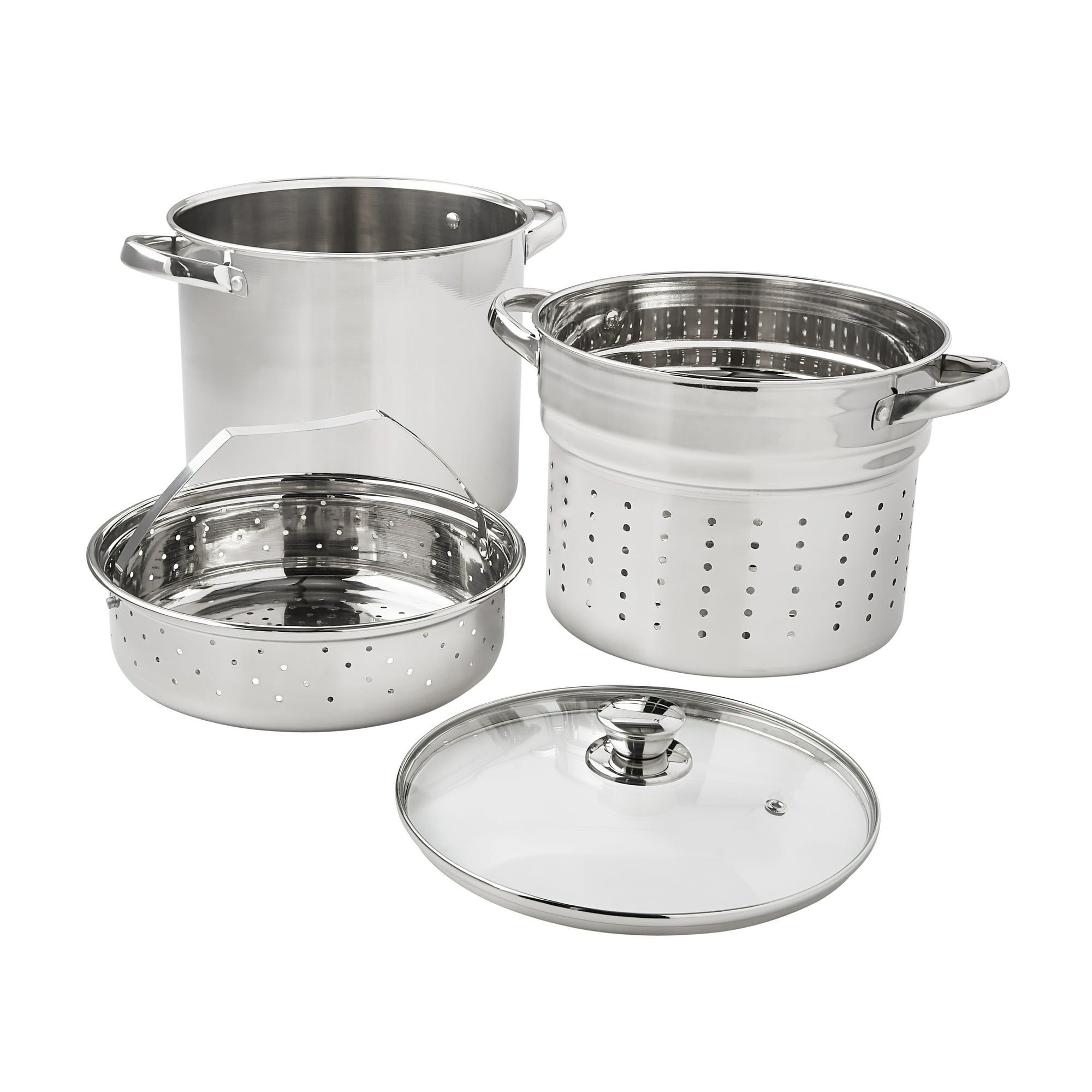 Prepare amazing sauces, pastas, potatoes, corn-on-the-cob, and more with the ample Mainstays Stainless Steel 8-Quart Multi-Cooker with Glass Lid. This large multi-cooker measures 9.76" L x 9.76" W x 12.60" H and is perfect for any occasion. The 4-piece set includes a stock pot, colander, steamer basket, and glass lid. Designed with stylish stainless steel and glass, it's sure to coordinate with your existing cookware. This sturdy multi-cooker features stay-cool handles, a heat- and shatter-resistant glass lid, durable, stainless steel construction, and a tri-ply base for quick and even cooking. Ideal for get-togethers, backyard barbecues, and other special events, the Mainstays 4-Piece Stainless Steel 8-Quart Multi-Cooker with Glass Lid is a must-have cookware item in any kitchen.