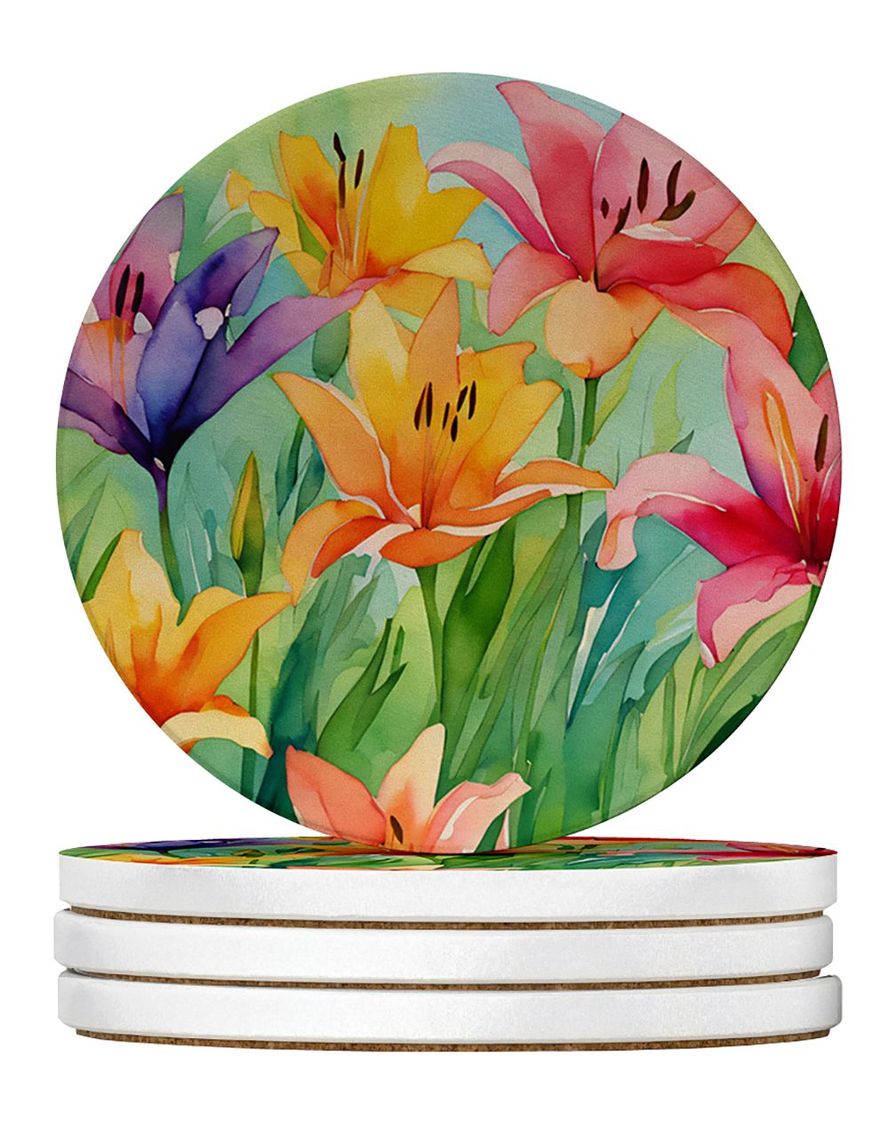 Home > Lilies in Watercolor Large Sandstone Coasters Pack of 4 Absorbent Round Coasters Decor Gifts for Men or Women, 4 in, Multicolor