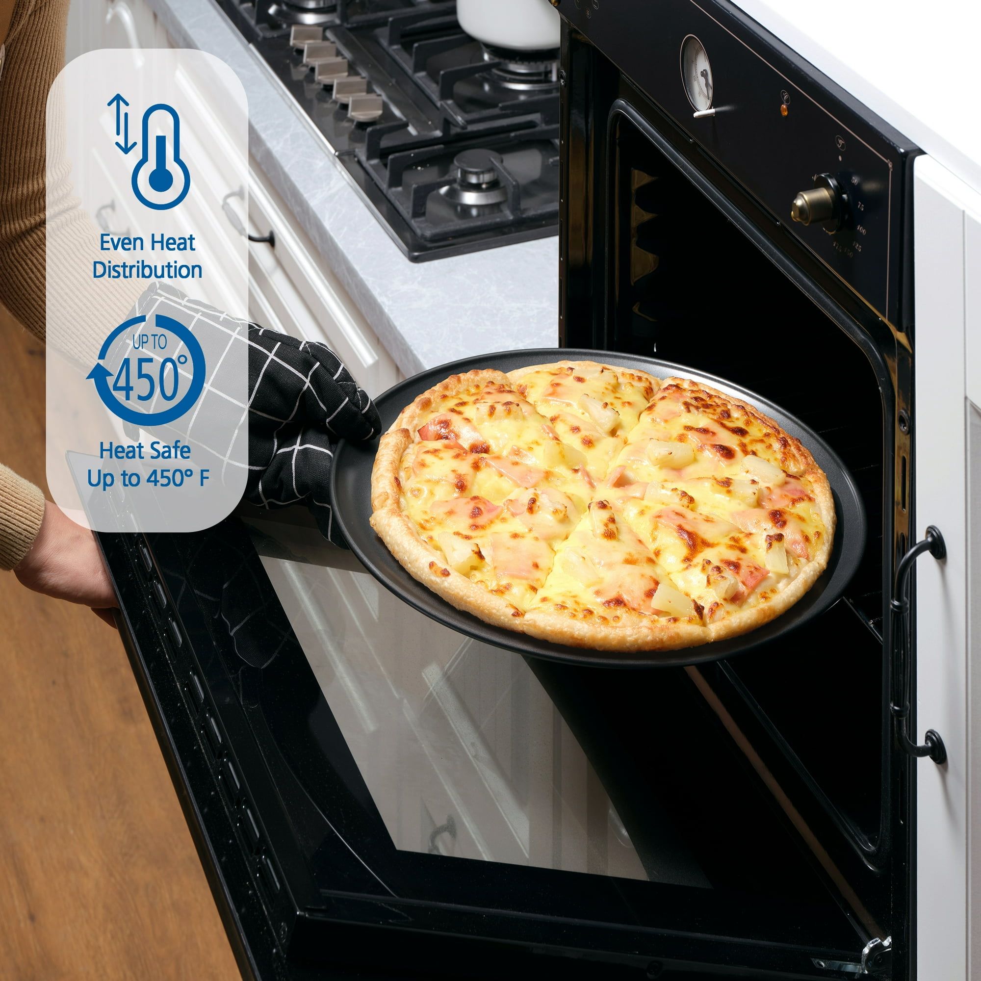 16-inch multi-purpose pizza pan/ baking tray has a good non-stick surface, which helps foods to slide right off, making cleanup easy. Made of reliable steel construction. It transfers heat greatly. Your pizza will not be burnt and will not be under-cooked either. Before first use and after each use, wash pan thoroughly with mild dishwashing detergent and warm water. Come and use it for homemade or frozen pizzas, or for high-quality family meals, desserts, and other gourmet meals.
