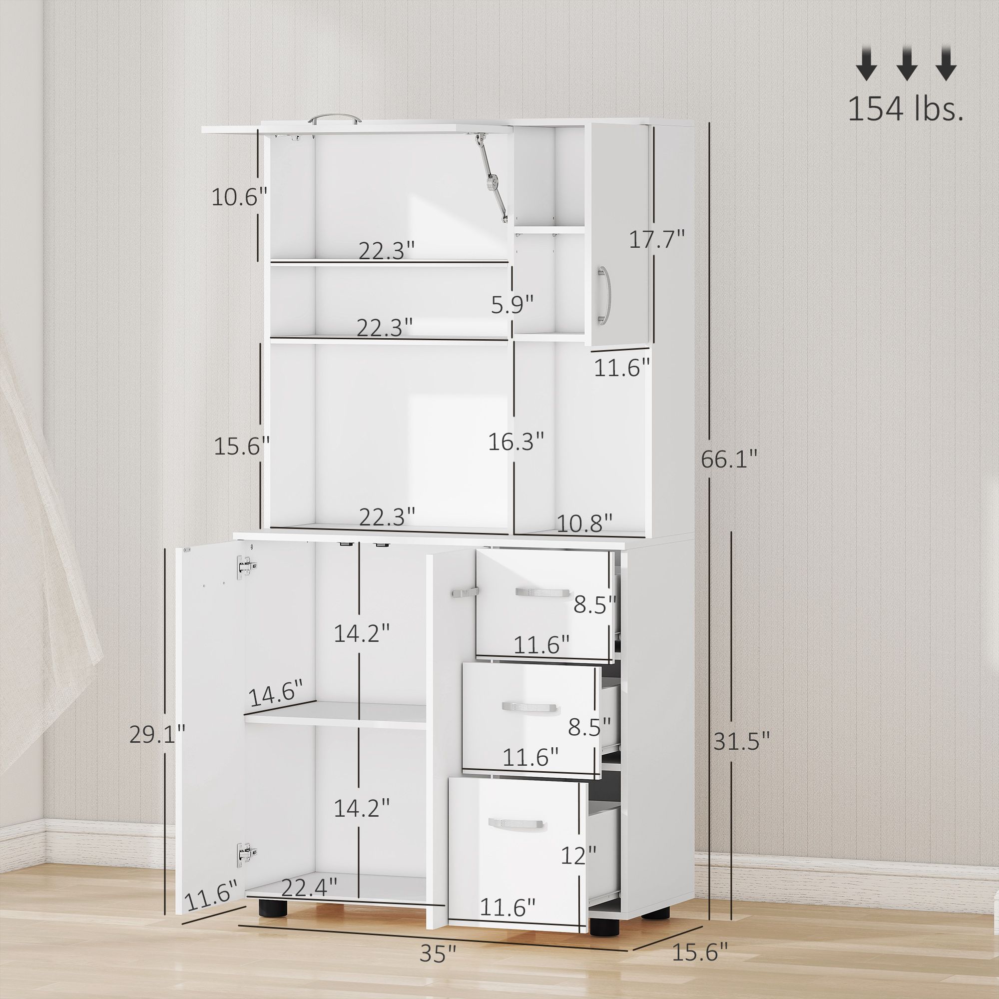 Kitchen storage cabinets from HOMCOM fit nicely with any modern decor and can be used in the kitchen, pantry, garage, or bathroom to create stylish additional storage. White coated MDF and particleboard provides an easy-to-clean, smooth surface. Ample storage cabinets and drawers plus an open countertop shelf provides an amazing amount of storage in this compact microwave cabinet.